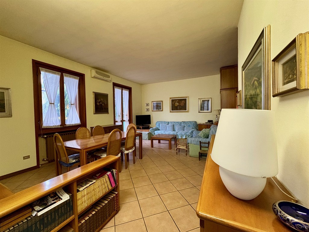 Essendo l’appartamento posto al primo piano, l’accesso al giardino avviene dall’ingresso dell’abitazione scendendo alcuni gradini, e non direttamente dai singoli locali. L’area verde rappresenta comunque uno spazio ideale per momenti di relax all’aperto e comprende anche una comoda zona di parcheggio per ulteriori veicoli, grazie alla presenza di un secondo cancello carraio su strada.