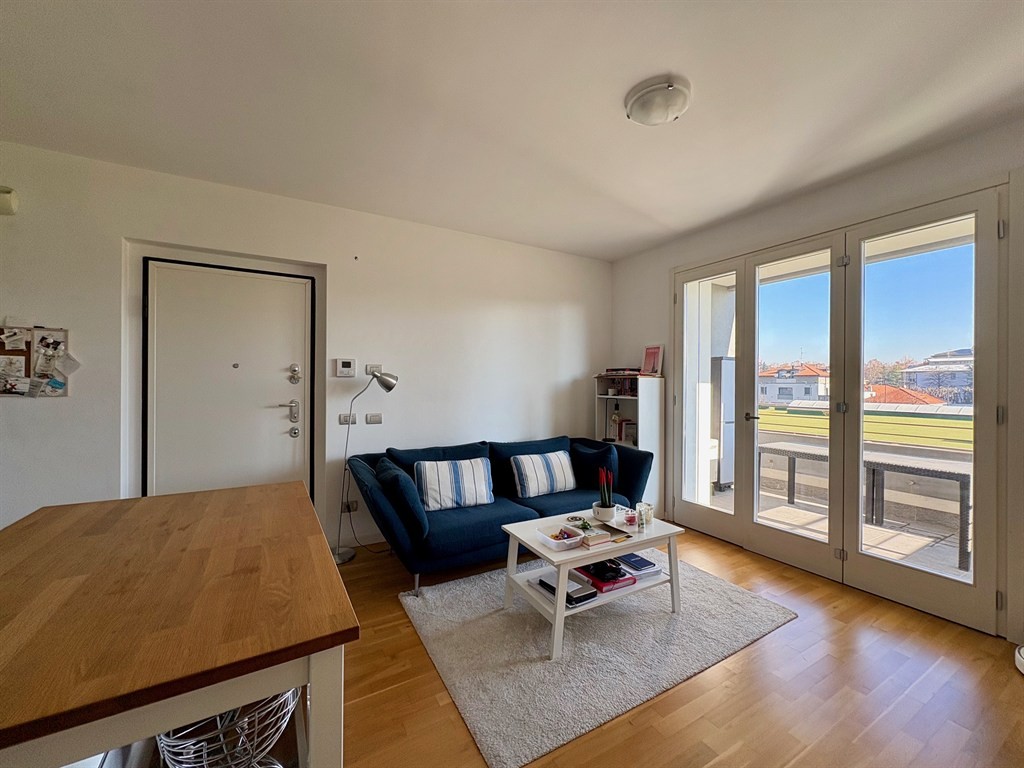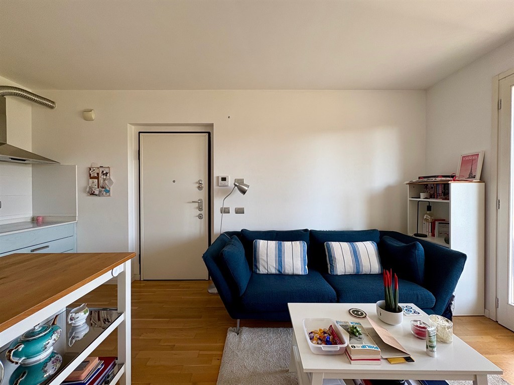 La zona giorno, luminosa e funzionale, si apre sull’angolo cottura e conduce al balcone ampio e vivibile.